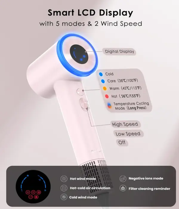 This ionic hair dryer features a powerful 150,000 RPM brushless motor that delivers ultra-fast drying while reducing heat exposure for healthier hair. With 500 million negative ions and smart temperature control, it helps minimize frizz and maintain smooth, shiny results. Its ultra-light, compact, and quiet design makes it an excellent choice for comfortable home use and easy travel