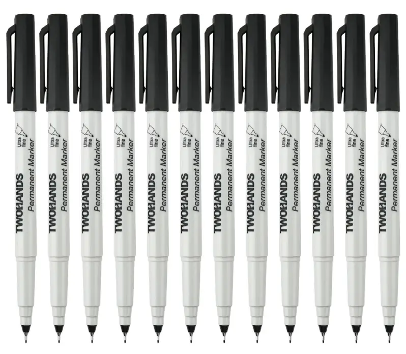 TWOHANDS Permanent Markers with an ultra-fine 0.5 mm tip deliver precise, crisp lines ideal for labeling, detailed writing, and fine marking tasks. The black permanent ink dries quickly and adheres reliably to most surfaces without smearing. This 12-count set offers consistent performance and long-lasting use for home, office, and professional applications